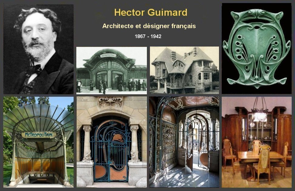 Brève biographie Hector-Germain Guimard, architecte et désigner français, est né le 25 mai 1867 à Lyon (Rhône) En 1885, il entre à l'école des Beaux-arts de Paris avec l'enseignement de Gustave Raulin En 1891, il devient professeur à l'École des Arts Décoratifs jusqu'en 1900. Il se rend au Royaume-Uni et surtout en Belgique où sa rencontre avec l'architecte Victor Horta fut décisive pour l'orientation de son style. Hector Guimard rejetant le modèle antique, enseigné dans les écoles des Beaux-arts, préféra l’imitation de la nature à la façon des artistes gothiques ou japonais. Il applique des principes déjà préconisés par Eugène Viollet-le-Duc architecte et théoricien. Le Castel Béranger est primé au concours de façades organisé par la Ville de Paris, En 1899 il remporte le concours portant sur les édicules destinés à couvrir les entrées des stations souterraines du Métropolitain. Guimard décide d’utiliser la fonte de fer. les édicules les fit comparer à des libellules déployant leurs ailes. Les critiques commencent à ce faire entendre critiquant son « végétalisme », le Modern style commence à passer de mode. Le Figaro demande même la destruction des édicules. Il se marie, en 1909, avec le peintre Adeline Oppenheim fille d'un banquier new-yorkais. En 1932 Guimard prononce l'éloge funèbre de son ami architecte Henri Sauvage La guerre arrivant en Europe par crainte de la guerre l’avait fait s’exiler (sa femme est juive) et étant malade, il part avec sa femme pour les Etats-Unis où ils s’installent à New York en 1938 Hector Guimard décède le 25 mai 1942 à New York complètement oublié
