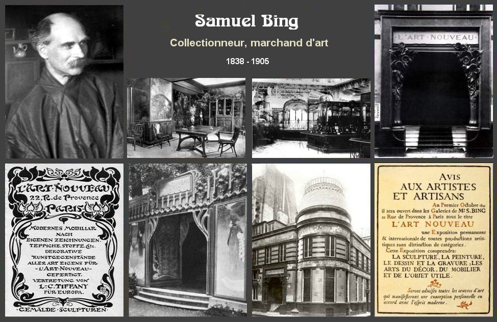 Brève biographie Siegfried Bing, dit improprement Samuel Bing est né le 26 février 1838 à Hambourg (Allemagne) Il arrive à Paris en 1854 pour travailler dans la société de son père, commerçant spécialisé dans la porcelaine. En 1863 il s'associe pour créer sa propre manufacture de porcelaine. Il reçoit une médaille lors de l'Exposition universelle en 1867. L'art japonais est pour lui une révélation. 1878 Exposition d'estampes japonaises à l'Ecole des beaux-arts. Il part en mission aux Etats-Unis en 1894, où il rencontre Louis Comfort Tiffany, maître verrier. Siegfried Bing parcourt l'Europe à la recherche d'idées et de créateurs. En 1895, il ouvre une galerie boutique, rue Chaussat à Paris 9e appelée l'Art Nouveau, où sont présentés objets et mobiliers de décoration. Son objectif est de rendre accessible à tous un intérieur harmonieux et raffiné. Il présente un pavillon à l'exposition universelle de Paris en 1900 : appelé la maison de « l'Art Nouveau Bing »,qui a été conçu par Georges de Feure soit quatre panneaux vitrés servant de fenêtres et représentant des élégantes. Des ensembles décoratifs de Eugène Gaillard, Edward Colonna et Georges de Feure crées à sa demande y sont exposées Samuel Bing est mort le septembre 1905 à Vaucresson (Hauts de Seine).