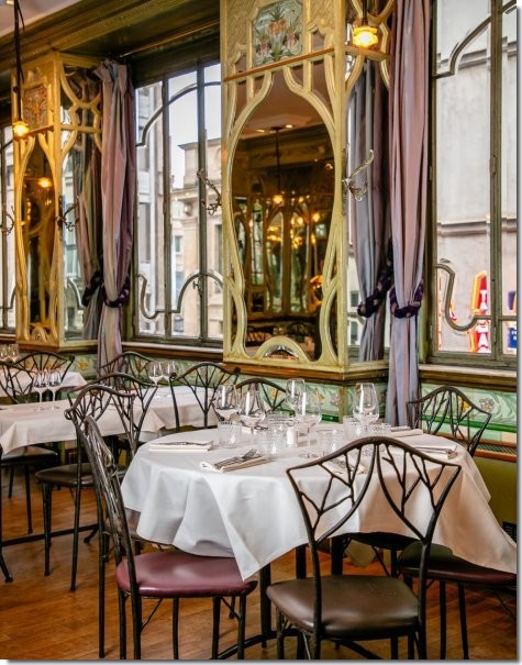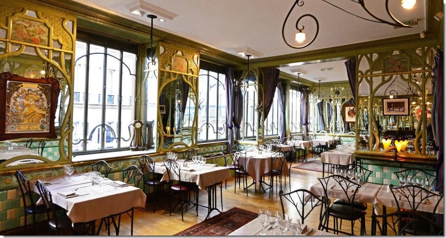 Cette décoration à base de miroirs et de panneaux en bois sculptés à forme végétale se retrouve à l'intérieur de la salle. Les murs incrustés de carreaux de faïences colorés sont rythmés par des structures de bois sculptés incrustés de miroirs et de verreries au décor à base d'iris et de roses Trémière Le restaurant a été entièrement réhabilité en 1996 pour des brasseurs belges. Inscription à l'inventaire des monuments historiques le 12 décembre 1995.