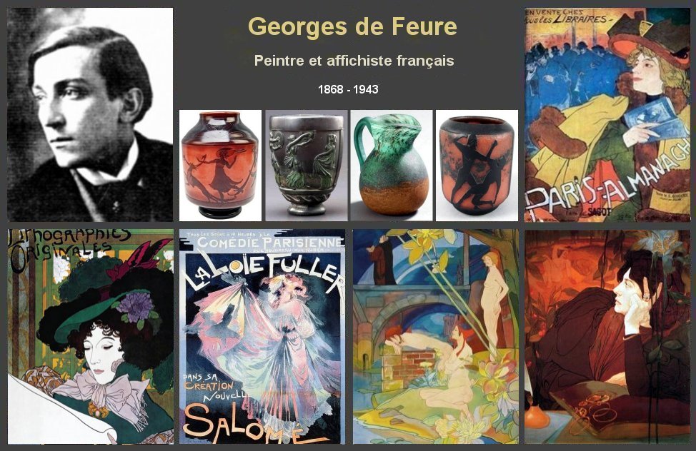 Brève biographie Georges de Feure, pseudonyme de Georges Joseph van Sluÿters, peintre, affichiste, est né le 6 septembre 1868 à Paris Fils d'un architecte hollandais et d'une mère belge. Il a commencé en tant que costumier et puis décorateur d’intérieurs à Paris. Dessinant au début des affiches, il a peint ensuite des compositions de symboliques d'inspiration Baudelairienne sur le thème de la femme. Avec Eugène Gaillard et Edouard Colonna il a été choisi par Siegfried Bing, fondateur de la boutique « L'Art Nouveau », pour concevoir des salles dans son pavillon à l'exposition Universelle de 1900. Il a conçu ensuite des meubles, tapis et de la verrerie. La conception des meubles a été basée sur le thème de la femme, soulignant les lignes sensibles. Georges de Feure est mort le 26 novembre 1943 à Paris