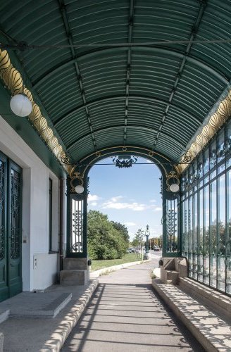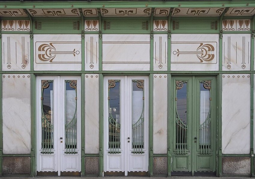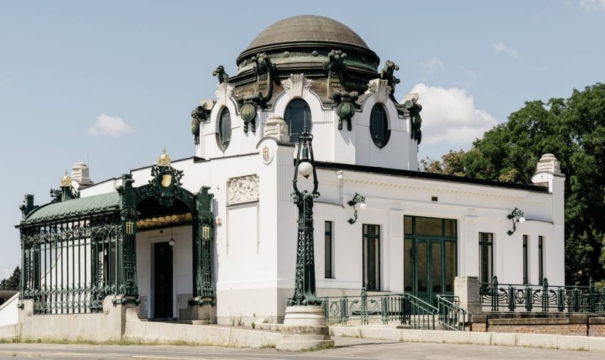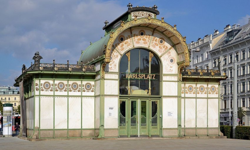 Le pavillon conçu en 1899 par l'architecte Otto Wagner pour l'accès au métro à Karlsplatz. L'architecte a été maître d'œuvre général responsable de toutes les tâches architecturales liées à la construction du Stadtbahn (chemin de fer urbain devenu par la suite le métro) de Vienne de 1894 à 1900