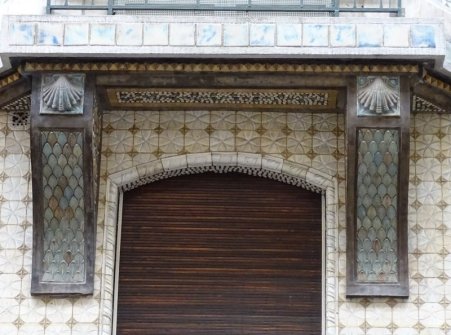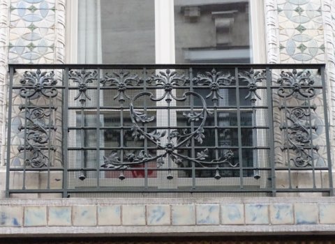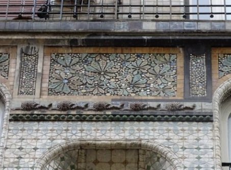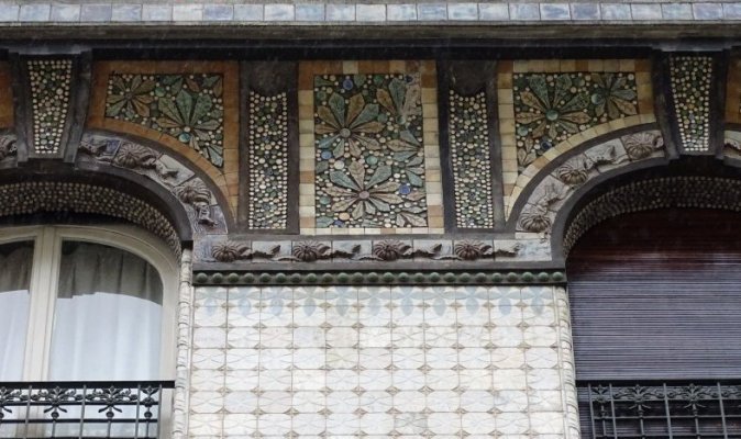 L’immeuble de Lahire est revêtu de carreaux géométriques de couleur crème ou d’un bleu ciel, limités à des cercles incisés s’interpénétrant pour former des rosaces. Les consoles des balcons sont plus richement décorées, avec des motifs d’écailles et de coquilles, des feuilles de marronniers et de simples pastilles diversement colorées.