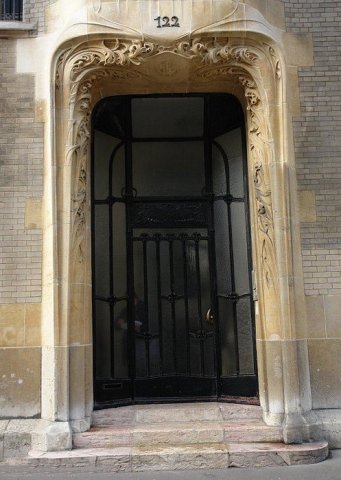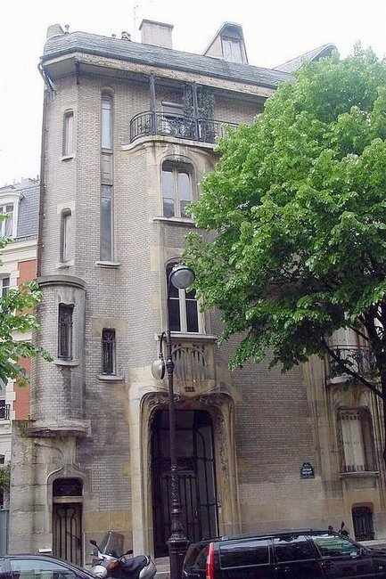 Les fenêtres d'angle du second niveau présentent un corps de rambarde avec un décor floral très fluide. Les deux façades sont très rythmées grâce à des ouvertures toutes différentes les unes des autres ornées par un décor fluide à motif de fleurs. Les soupiraux, au niveau de la rue, sont protégés par une barre de ferronnerie elle-même très travaillée Suite à son décès sa veuve propose aux autorités françaises de transformer l’hôtel de l’avenue Mozart en musée, mais elle essuie un refus et le mobilier est alors dispersé et des archives détruites. Peintures intérieures de Adeline Oppenheim son épouse. Protection Monuments historiques du 4 décembre 1964, c'est la première réalisation d'Hector Guimard à être protégée. L'avenue Mozart est ouverte en 1867. Hector Guimard décide d'élever sa maison au n°122, il aménage là son logis et ses bureaux d'études. Il s'agit là d'une des plus belles réalisations de l'architecte ramassée, légère en même temps que trapue, on a l'impression ici de se trouver devant l'élégant quartier général d'une armée victorieuse. A première vue, le curieux est frappé par le soin qu'a eu le bâtisseur de répartir d'une manière inexplicable fenêtres et balcons; ils sont tous taillés différemment placés à des endroits où l'on ne les attend pas, telle la fenêtre du second étage dont le quart se situe dans l'angle du bâtiment et qui, hautaine, parait négliger la baie du dessous classiquement disposée. Particulièrement remarquable est le balcon supérieur du troisième étage surmonté par deux lanternes que l'on retrouve souvent chez Guimard. Le porche d'entrée est superbe; haut, spacieux, il a pu inspirer Lalique lorsqu'il a édifié l'immeuble du Cours la Reine. L'architecte a apporté également tous ses soins à la façade donnant sur la villa Flore, ainsi a-t-il placé symétriquement la grande baie du dernier étage qui éclaire l'atelier du maître et celle du rez-de-chaussée qui, avec ses consoles de pierre au nombre de quatre, semble soutenir le reste du bâtiment. La structure de l'immeuble est en pierre de taille, la brique, encore massivement employée, par ses couleurs discrètes se remarque moins. Plus qu'ailleurs, on ne sait pas très bien faire ici la part entre le rationnel et l'irrationnel. La demeure est emplie du souvenir de Guimard, il l'a élevée pour recevoir dignement Adèle Oppenheim, américaine, peintre de talent, avec laquelle il s'unira l'année de construction de cette villa. Nous sommes en 1912, Guimard approche de la cinquantaine; s'efforçant toujours d'emporter des marchés, mais les gens de l'immobilier à la beauté préfèrent le rendement; nombre de plans resteront dans les cartons. Guimard va s'essoufflant après les styles nouveaux, il les rattrapera, mais il ne les dépassera pas.