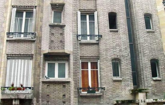 Le talent du constructeur se marque par ces gouttières en ciment "Eternit" noblement présentées à la façon des colonnes antiques: un emploi qui n'aurait pas déplu à Viollet-le-Duc 1926, nous sommes au début de la grande récession; on est allé ici à "l'économie", mis à part les soutènements en pierre et les soutiens des balcons, l'ensemble est édifié en briques toutes de la même couleur, plus éteintes que celles employées les années précédentes. Qui reconnaîtrait rue Greuze le bâtisseur qui, 25 ans plus tôt, éleva le Castel Béranger, l'architecte ne paraît plus ici satisfait de son entreprise, la signature, on la chercherait en vain. La page est définitivement tournée.