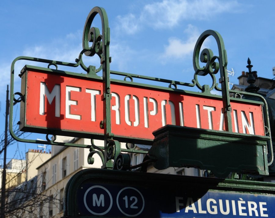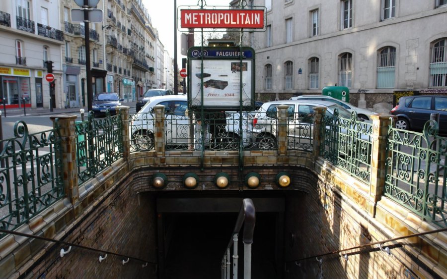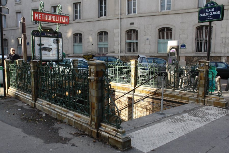 La station a été ouverte en 1910 sur la ligne n°12 Mairie d'Issy - Porte de la Chapelle. Son rend hommage à Alexandre Falguière (1831-1900), sculpteur et peintre français du XIXe siècle. L'entrée de la station Falguière se trouve place Camille Claudel à l'angle de la rue du Cherche Midi et de la rue de Vaugirard.