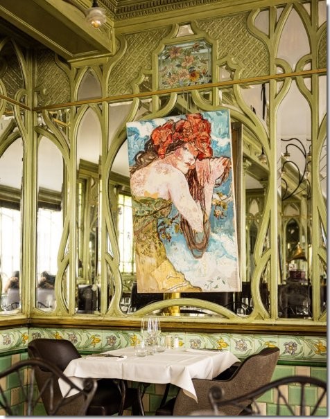 Cette décoration à base de miroirs et de panneaux en bois sculptés à forme végétale se retrouve à l'intérieur de la salle. Les murs incrustés de carreaux de faïences colorés sont rythmés par des structures de bois sculptés incrustés de miroirs et de verreries au décor à base d'iris et de roses Trémière Le restaurant a été entièrement réhabilité en 1996 pour des brasseurs belges. Inscription à l'inventaire des monuments historiques le 12 décembre 1995.