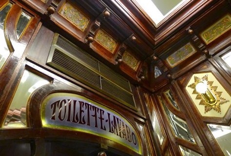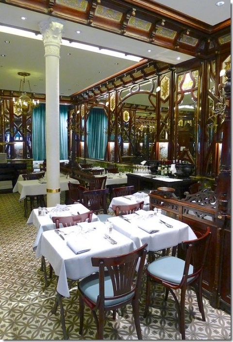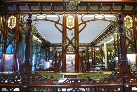 A l'intérieur, la salle reçoit un décor foisonnant Art nouveau avec boiseries courbes, miroirs ainsi que faïences aux motifs de fruits et 36 paysages de Pivain, peints sur pâte de verre. Une verrière comportant des fleurs recouvre une ancienne cour intérieure. Classé Monument Historique en 1983 : façade et salles avec leur décor.